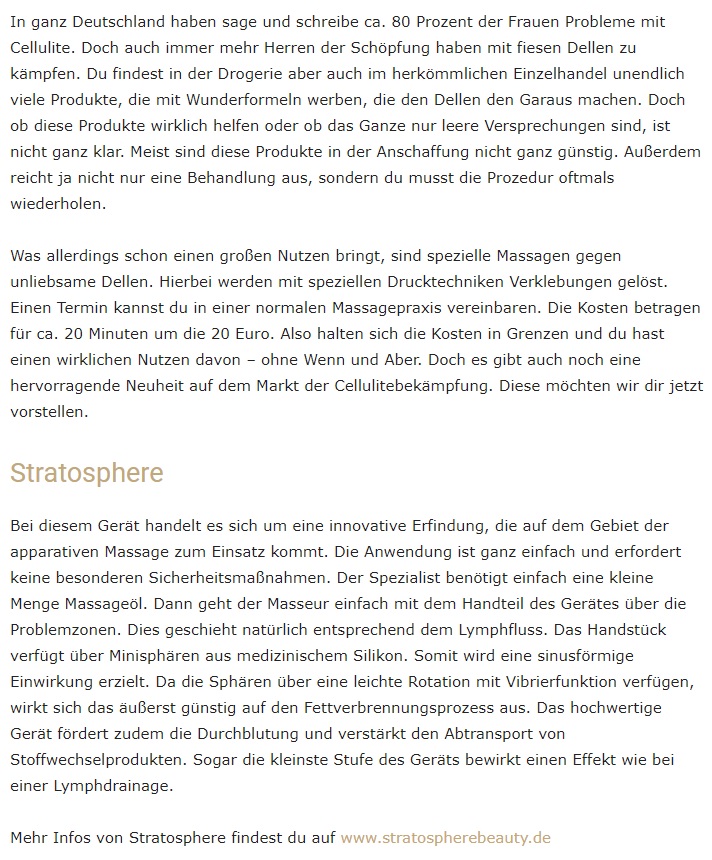 О массаже Stratosphere написало известное немецкое издание AJOURE. Читательницы этого женского журнала – современные женщины, которые интересуются тенденциями моды, вдохновляющим лайфстайлом и, конечно же, действенным уходом за телом.