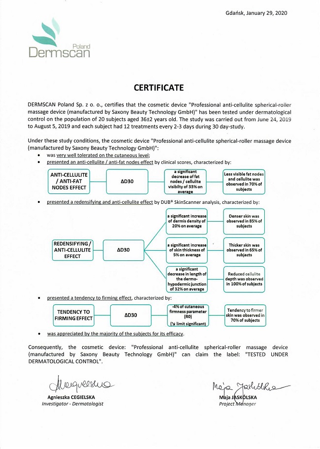 Высокая эффективность массажа с помощью аппарата TM Stratosphere (Стратосфера) клинически доказана независимой лабораторией Dermscan.